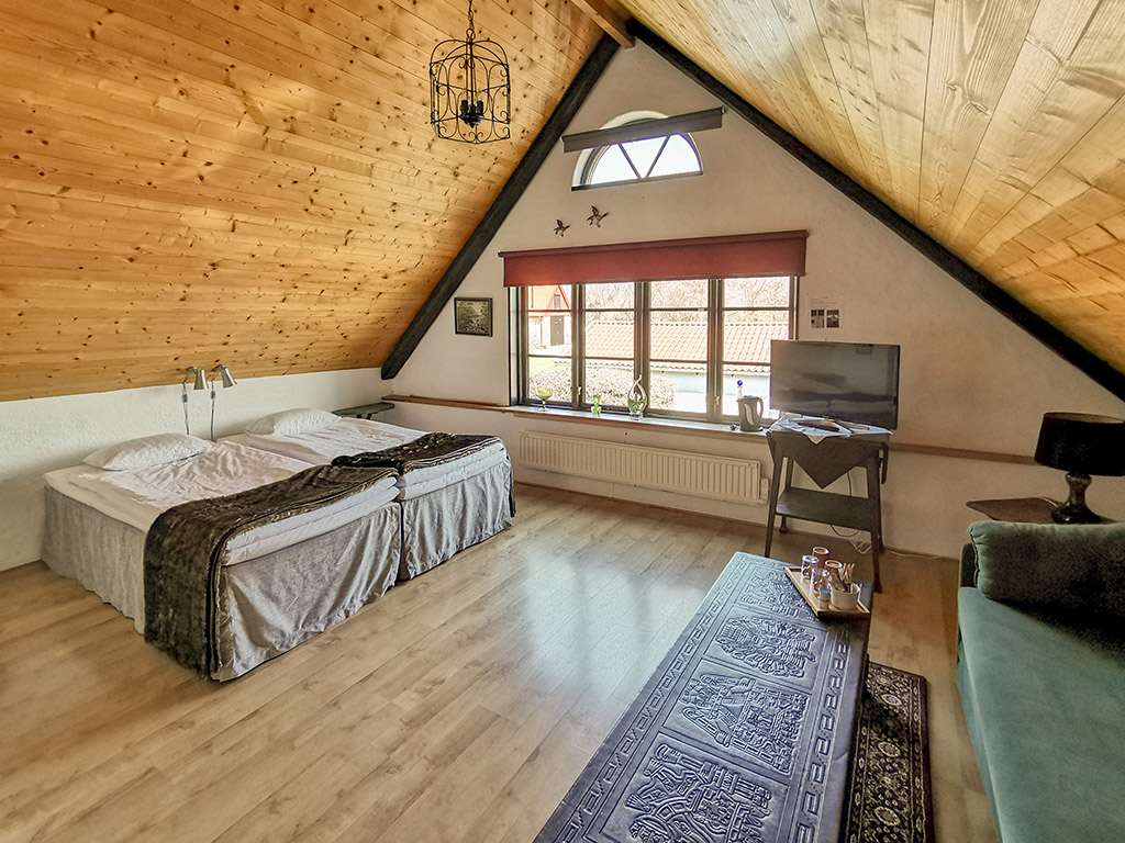 Show room Go to bookingA small cozy room under the ridge behind the main building. own small balcony to enjoy the sun on. The room has its own entrance via stairs on the gable to the east. ;